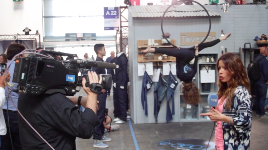 Espectáculo de danza aérea en Aro para presentar el nuevo tejido elástico del fabricante TAVEX en el expositor del mismo de Fira Barcelona en la Denim Premiere Vision.